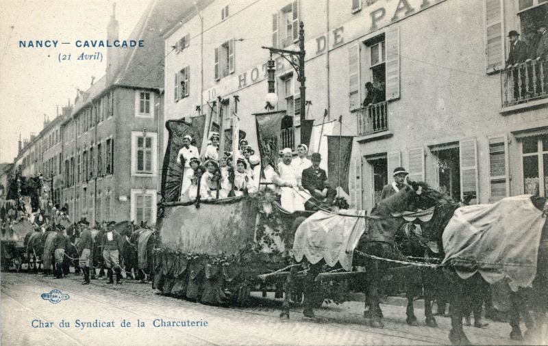 galerie / 08 - Fêtes et manifestations officielles et civiles, expositions... / 2 - Fêtes et manifestations publiques non sportives / 1921 - 2 - Cavalcade 21 avril / Légendes "normales" bleues / Char du Syndicat de la Charcuterie