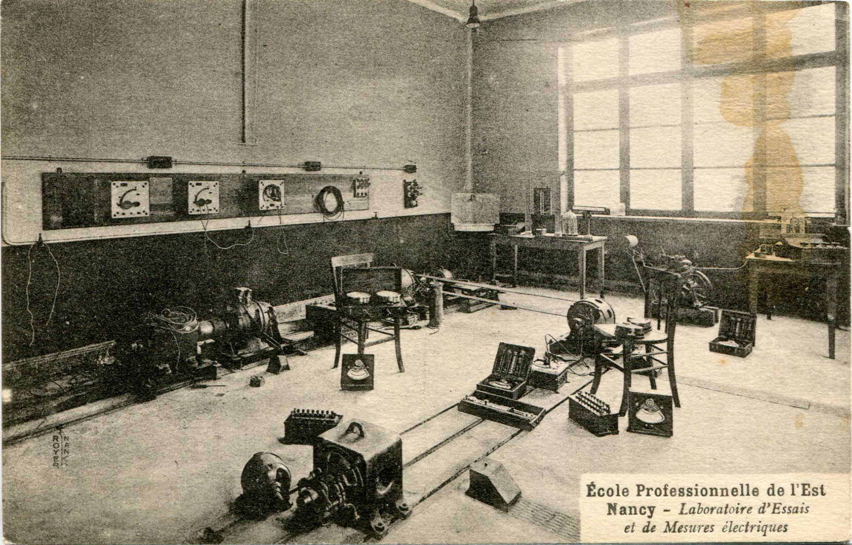galerie / 05 - Enseignement / 07 - Enseignement professionnel / 02 - École Professionnelle de l'Est (actuel "Lycée Loritz") / 2 - École Professionnelle de l'Est (série avec légende dans un cartouche) / Laboratoire d'essais et de mesures électriques