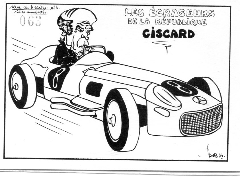 galerie / 05 - Cartes postales "philosophiques et politiques" / 6 - Jacques Lardie : Cartes modernes philosophiques et maçonniques / 2 - Cartes politiques de Jacques Lardie / 12 - Série "Les écraseurs de la République" (série de 4 cartes) / 3-Giscard